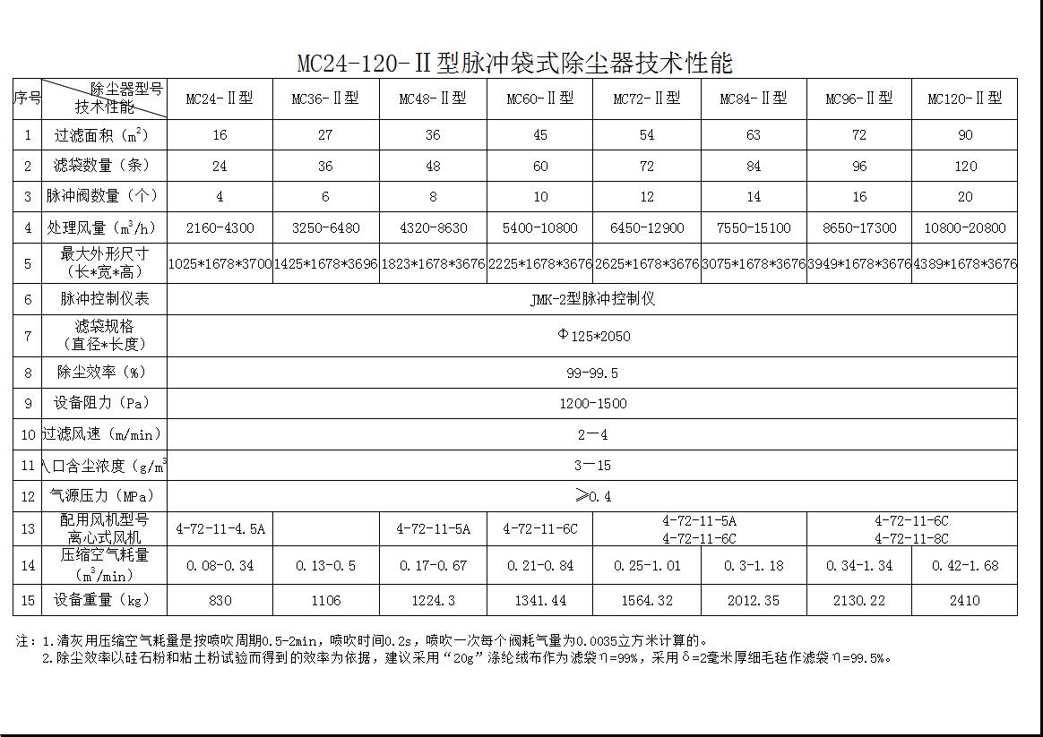 MC-Ⅱ型脈沖袋式除塵器有灰斗,進(jìn)氣口,上箱體、下箱體(內(nèi)置除塵過濾布袋)、出氣口、引風(fēng)機(jī)、電磁閥及配套氣泵組成。工作時(shí),含塵氣體由進(jìn)氣口進(jìn)入灰斗,粗粒塵直接落入灰斗底部,細(xì)粒塵隨氣流向上進(jìn)入上箱體,粉塵積附在濾袋外表面,凈氣通過各濾袋口匯集到上箱體內(nèi)至出氣口經(jīng)引風(fēng)機(jī)排出。隨過濾過程的不斷進(jìn)行,濾袋外表層積塵逐漸增多,從而使收塵器阻力增高,當(dāng)阻力升至一定范圍(1200~1500Pa),清灰控制系統(tǒng)發(fā)出信號(hào),通過自動(dòng)脈沖控制儀打開脈沖閥,壓縮空氣經(jīng)噴管向每條濾袋噴射氣流,使濾袋產(chǎn)生變形,震動(dòng),積附在濾袋外表面的粉塵被吹落至灰斗內(nèi),達(dá)到清灰的目的。